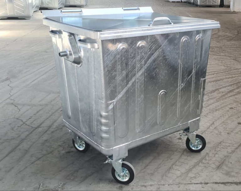 Container metalic cu volum de 1100L destinat colectarii deșeurilor, echipat cu 4 roți pivotante si capac plat realizat din otel.